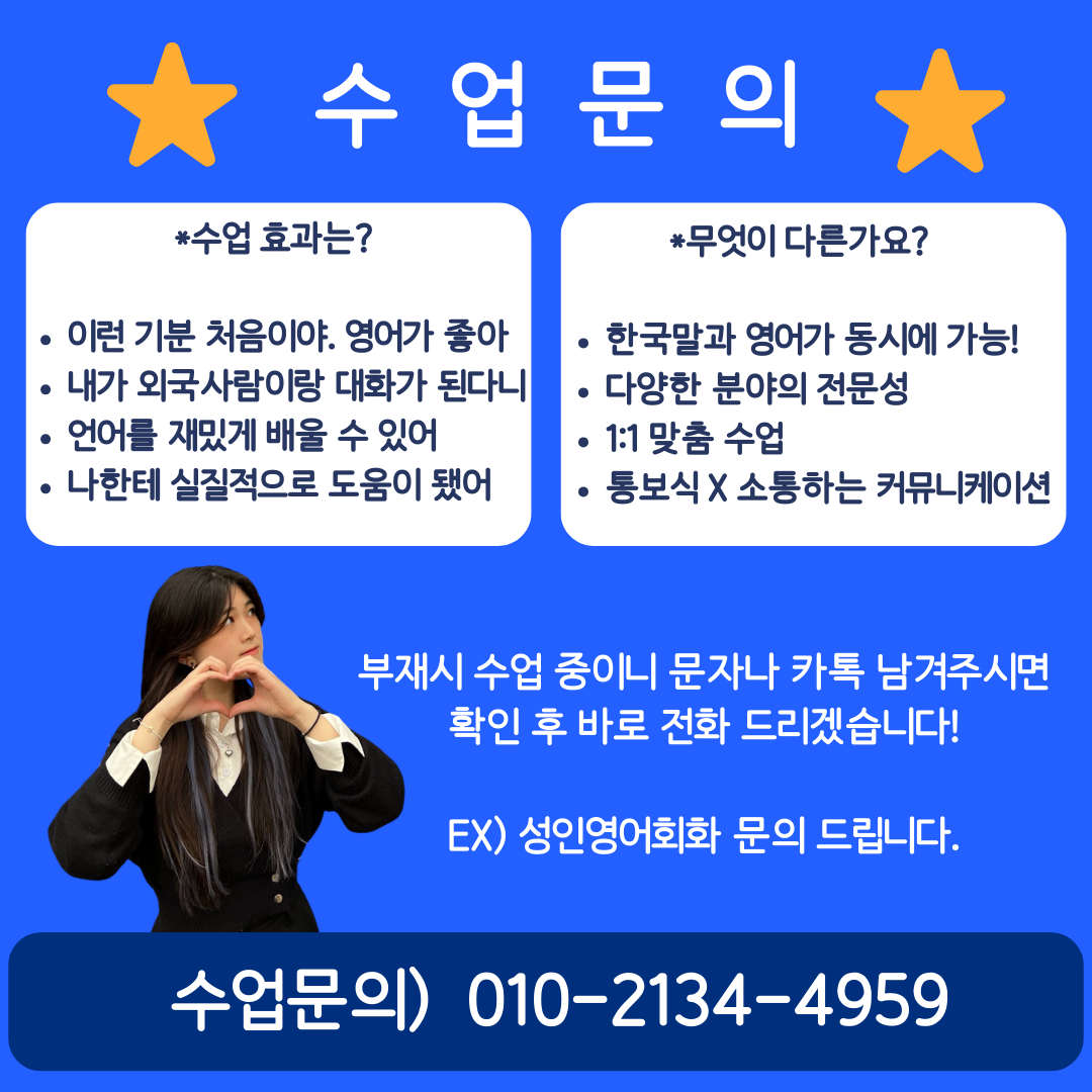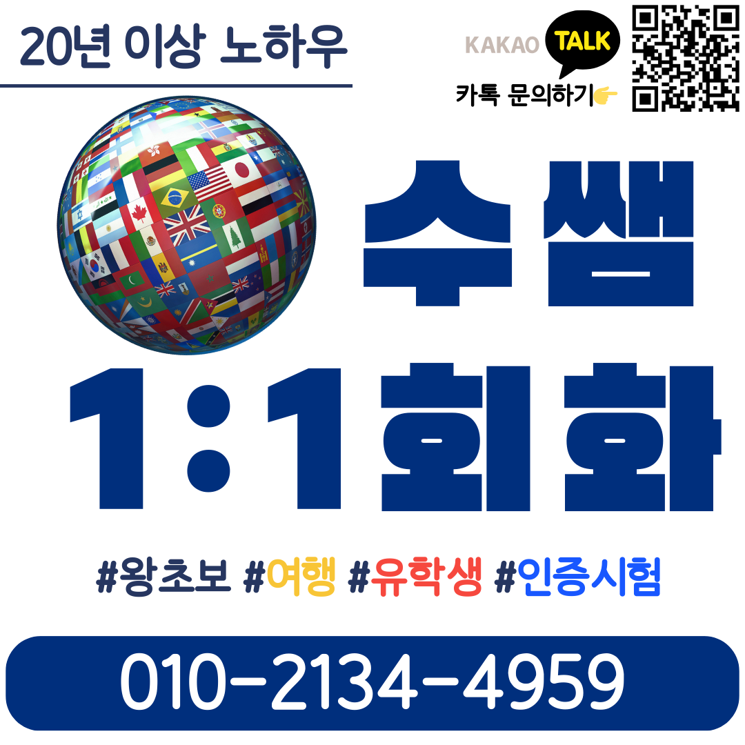 | 서부동 영어회화 해외여행 왕초보 토익 스피킹 텝스 오픽 아이엘츠 외국인 친구와 대화하기 (0) | 2024.04.15 |